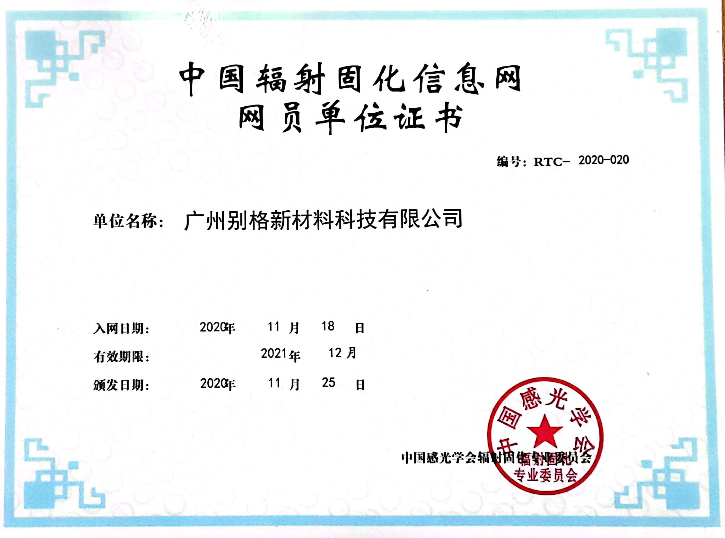 中國輻射固化(huà)信息網網(wǎng)員單位證書